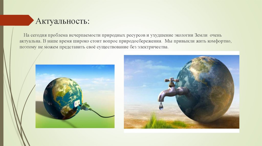Актуальность:На сегодня проблема исчерпаемости природных ресурсов и ухудшение экологии Земли очень
