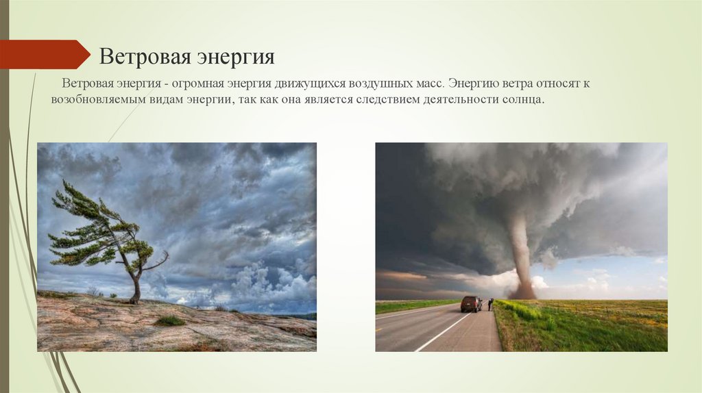 Ветровая энергияВетровая энергия - огромная энергия движущихся воздушных масс. Энергию ветра относят к