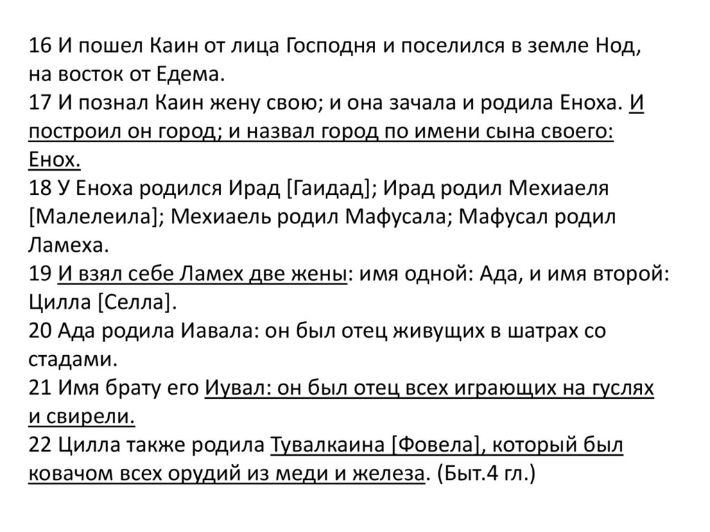 17 И познал Каин жену свою; и она зачала и родила Еноха. И
