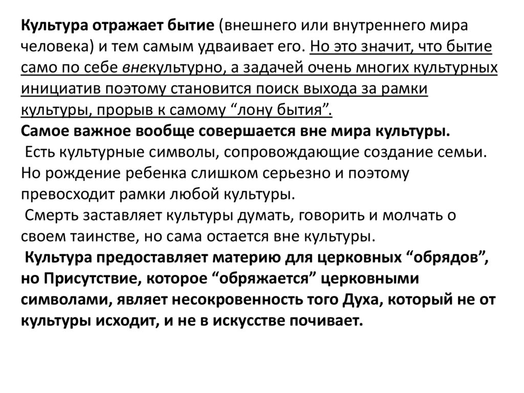 Культура отражает бытие (внешнего или внутреннего мирачеловека) и тем самым удваивает его. Но это значит, что бытие