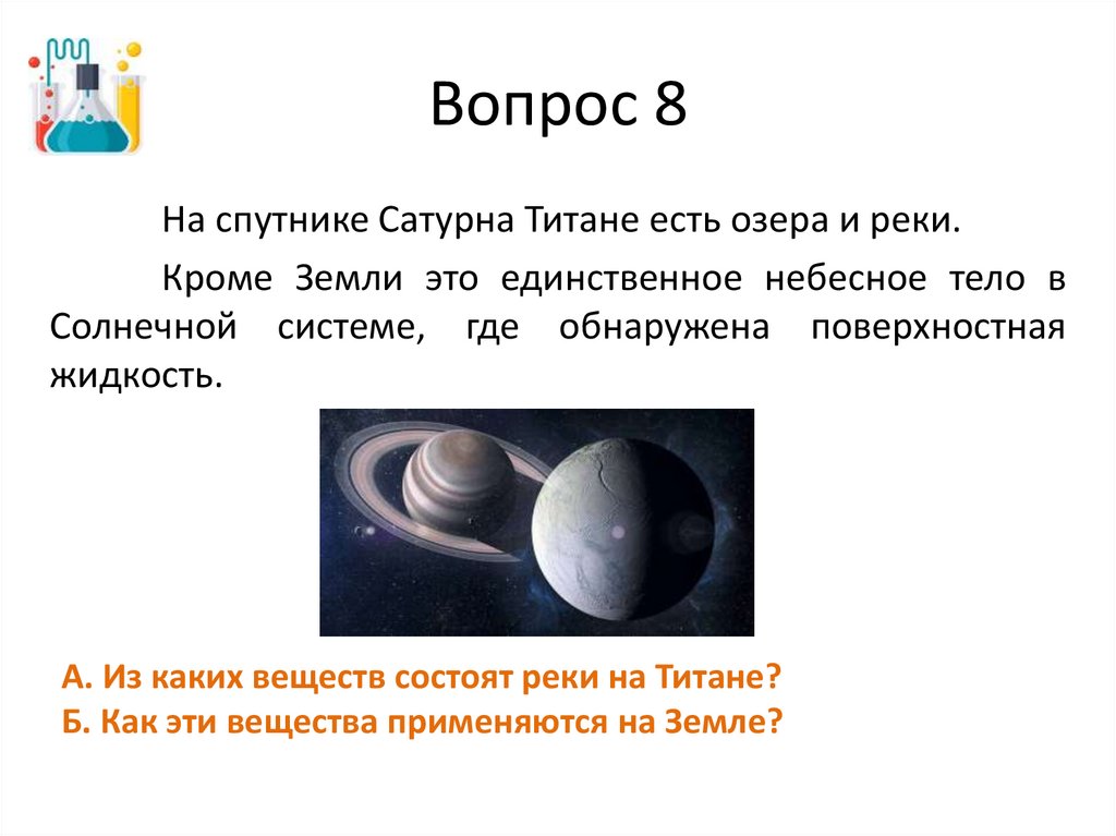 Вопрос 8На спутнике Сатурна Титане есть озера и реки.