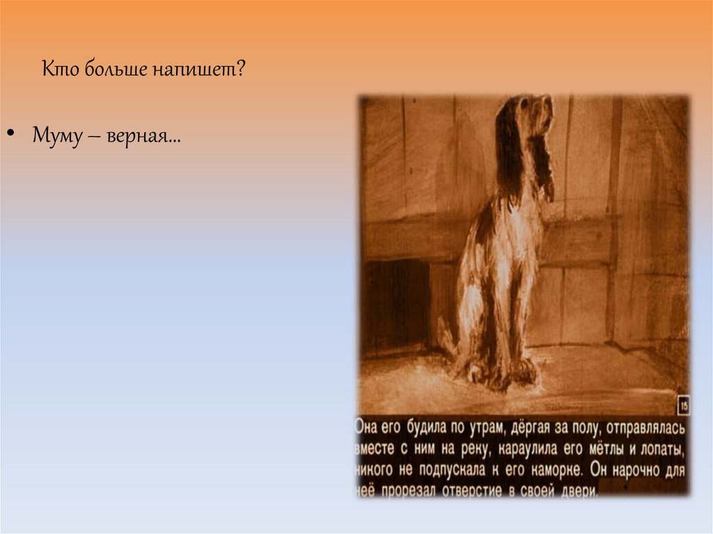 Кто больше напишет?• Муму – верная…