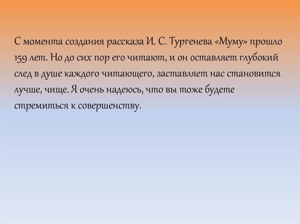 С момента создания рассказа И. С. Тургенева «Муму» прошло159 лет. Но до сих пор его читают, и он оставляет глубокий