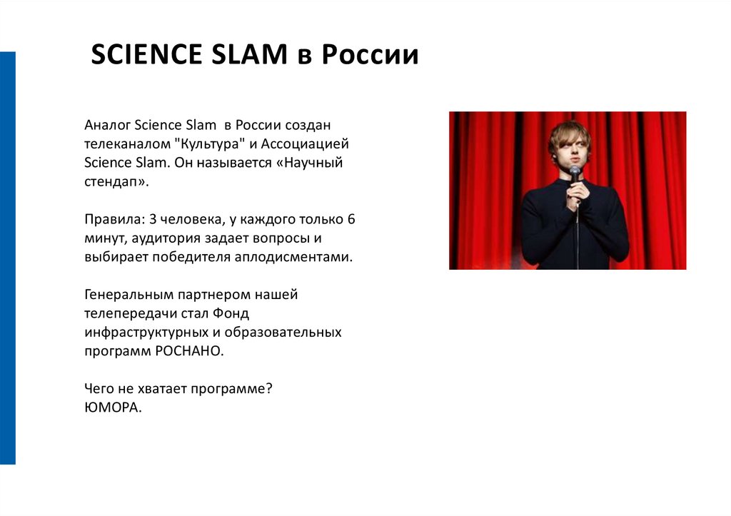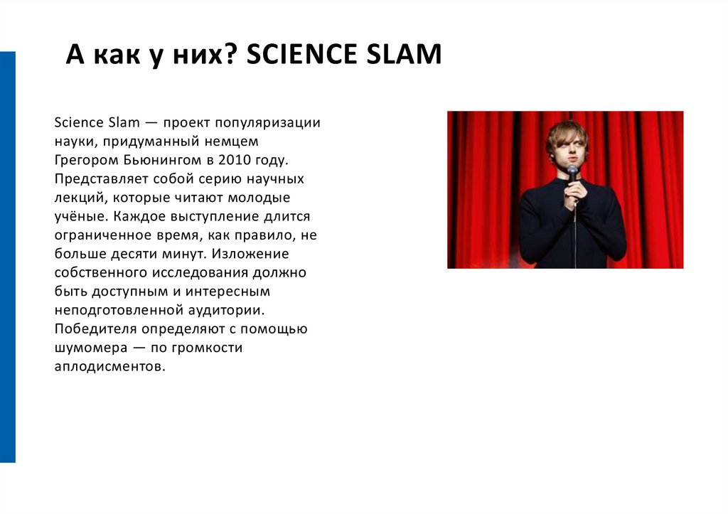 А как у них? SCIENCE SLAMScience Slam — проект популяризации