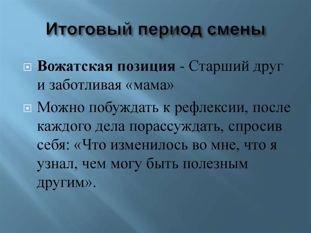 Позиция вожатого: Заботливая, но в мерустрогая и требовательная «мама».