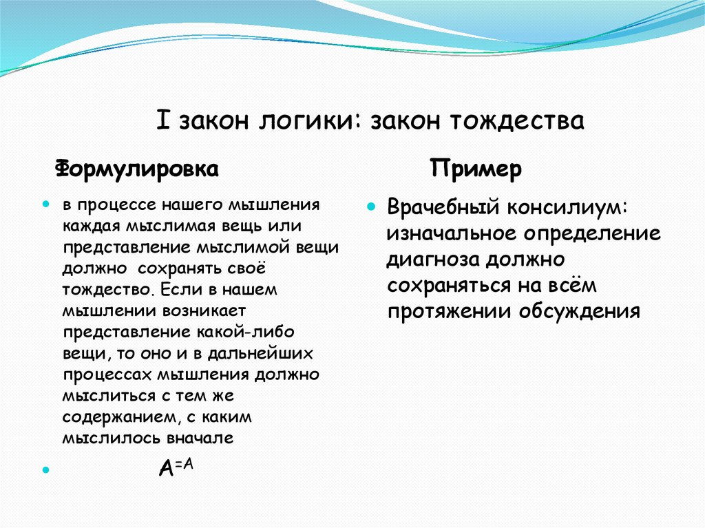 I закон логики: закон тождестваФормулировка