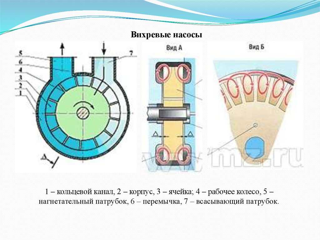 Вихревые насосы1 – кольцевой канал, 2 – корпус, 3 – ячейка; 4 – рабочее колесо, 5 –