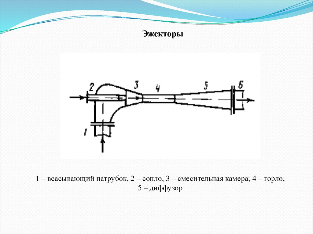Эжекторы1 – всасывающий патрубок, 2 – сопло, 3 – смесительная камера; 4 – горло,