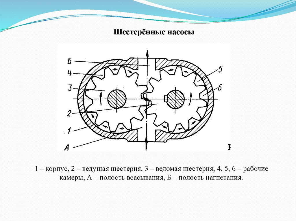Шестерённые насосы1 – корпус, 2 – ведущая шестерня, 3 – ведомая шестерня; 4, 5, 6 – рабочие
