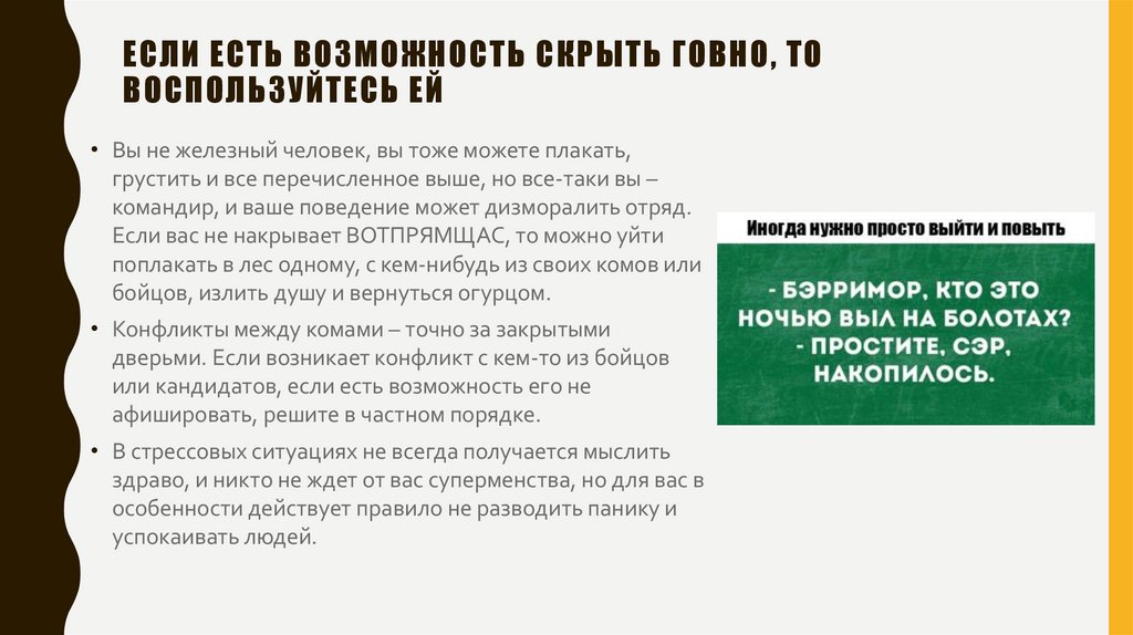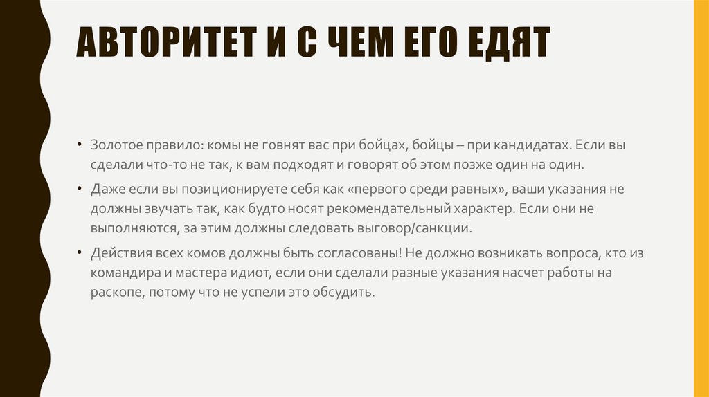 АВТОРИТЕТ И С ЧЕМ ЕГО ЕДЯТ• Золотое правило: комы не говнят вас при бойцах, бойцы – при кандидатах. Если вы