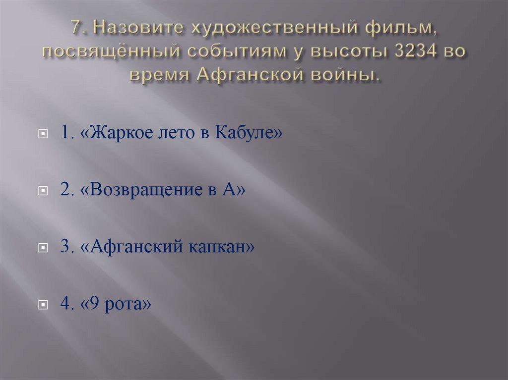 1. «Жаркое лето в Кабуле»2. «Возвращение в А»