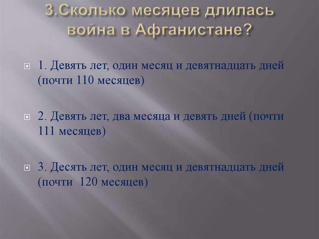 1. Девять лет, один месяц и девятнадцать дней(почти 110 месяцев)