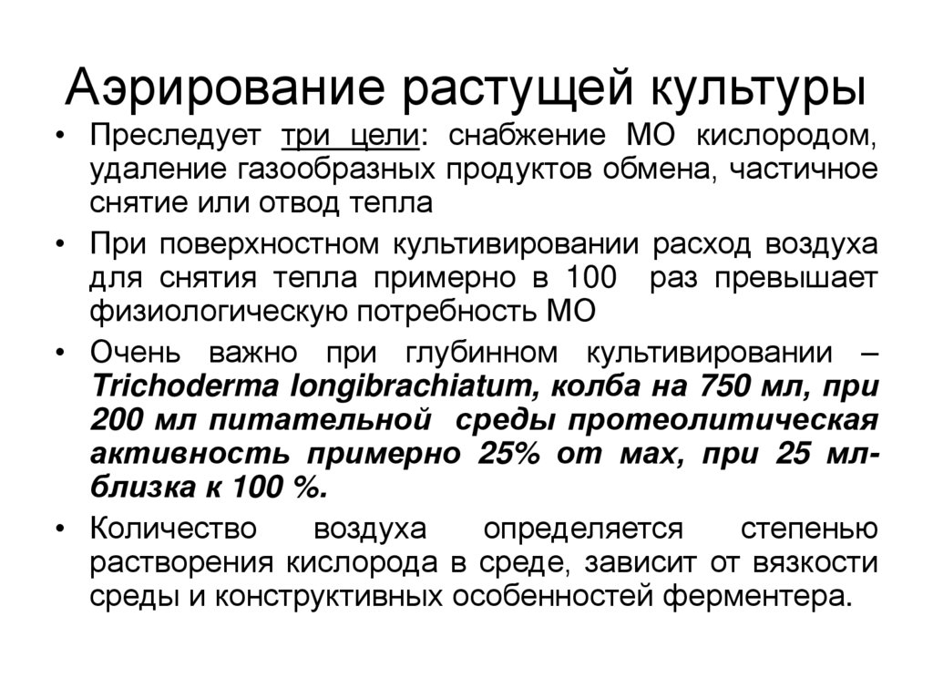 • Очень важно при глубинном культивировании –