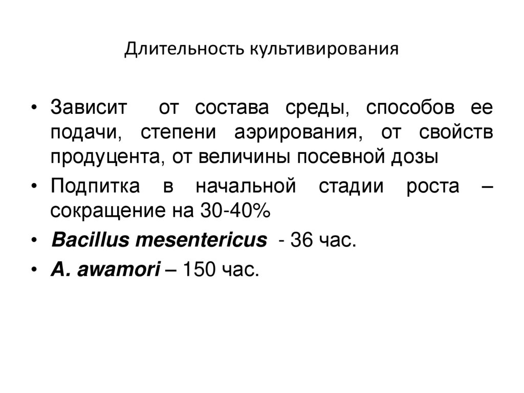 Длительность культивирования• Зависит