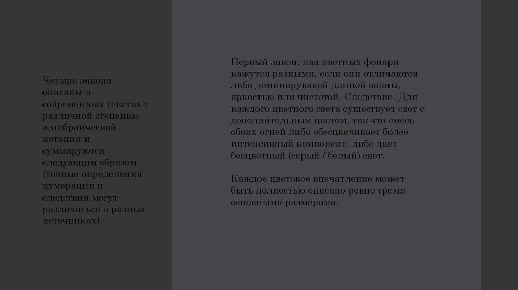Третий закон: есть огни с разным спектральным распределением мощности, нокажутся одинаковыми. Первое следствие: такие идентичные появляющиеся огни
