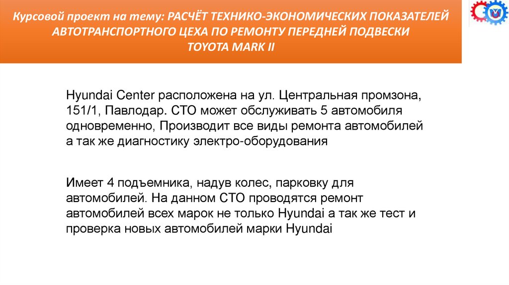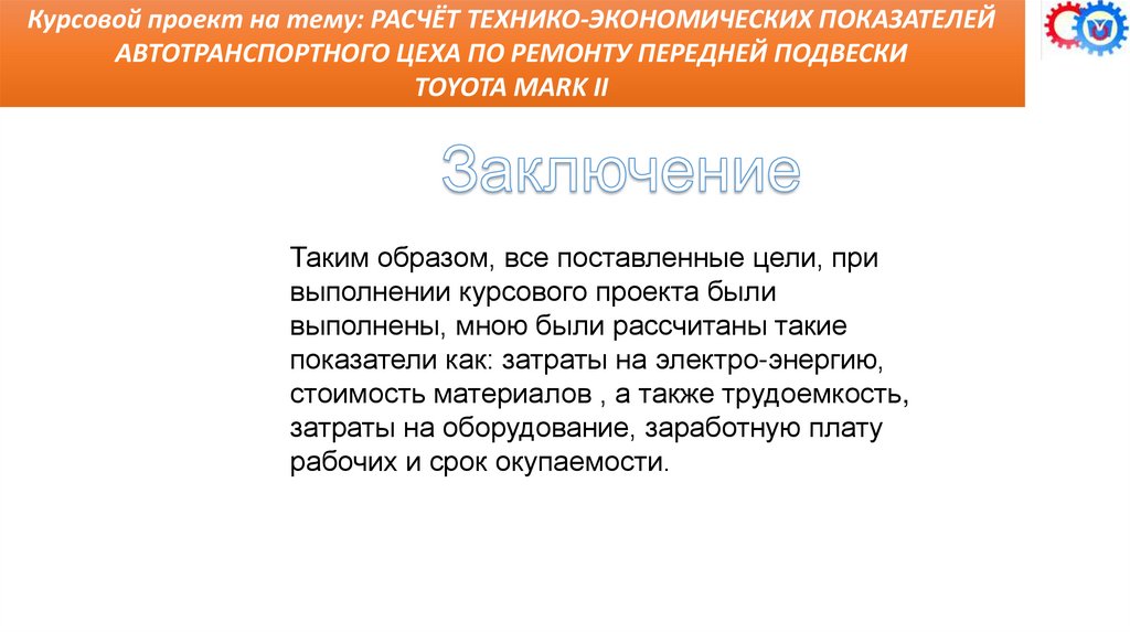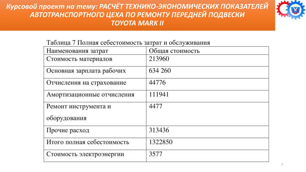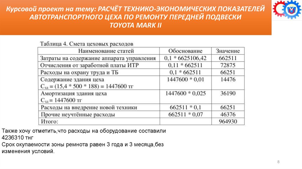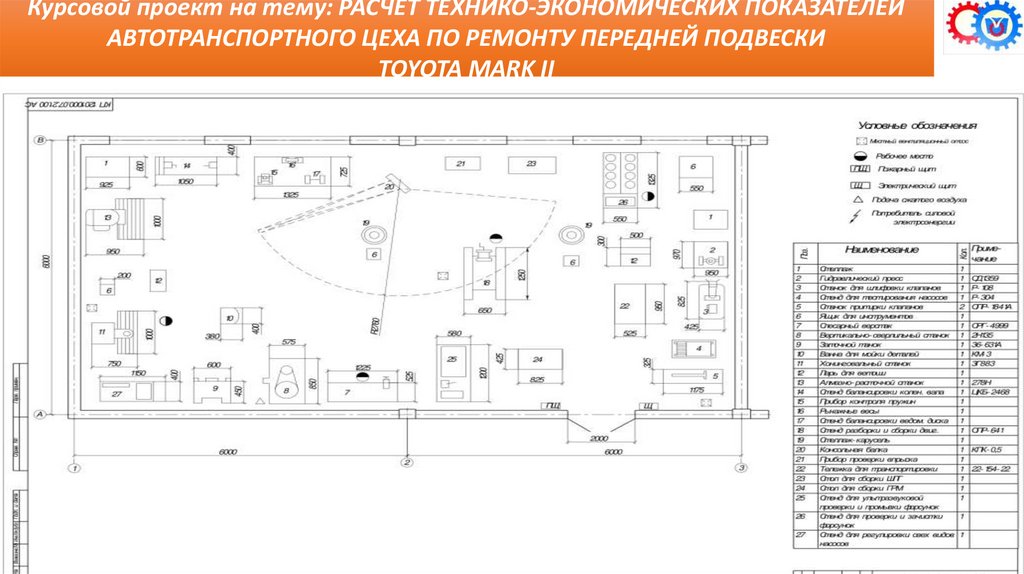 Курсовой проект на тему: РАСЧЁТ ТЕХНИКО-ЭКОНОМИЧЕСКИХ ПОКАЗАТЕЛЕЙАВТОТРАНСПОРТНОГО ЦЕХА ПО РЕМОНТУ ПЕРЕДНЕЙ ПОДВЕСКИ