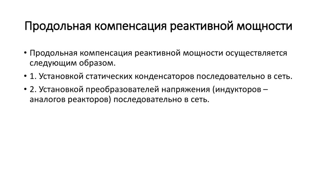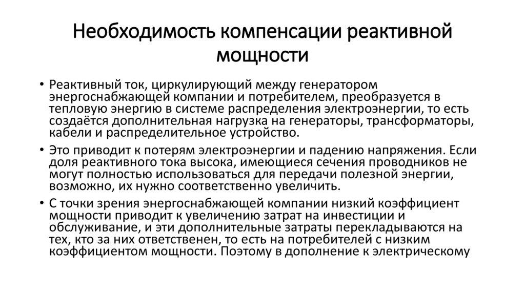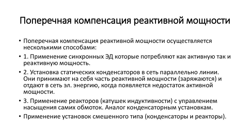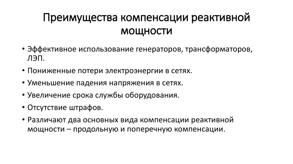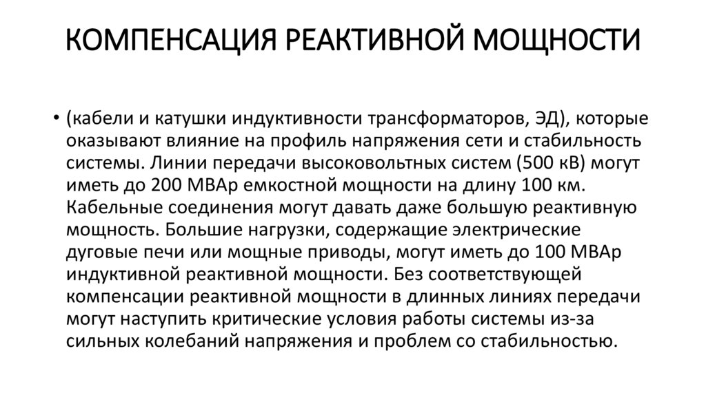 КОМПЕНСАЦИЯ РЕАКТИВНОЙ МОЩНОСТИ• (кабели и катушки индуктивности трансформаторов, ЭД), которые