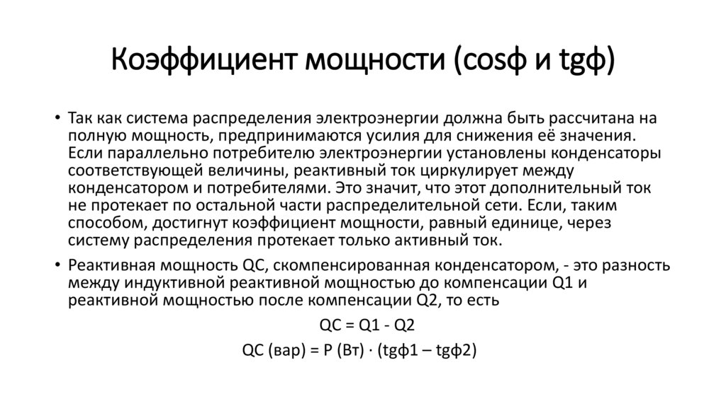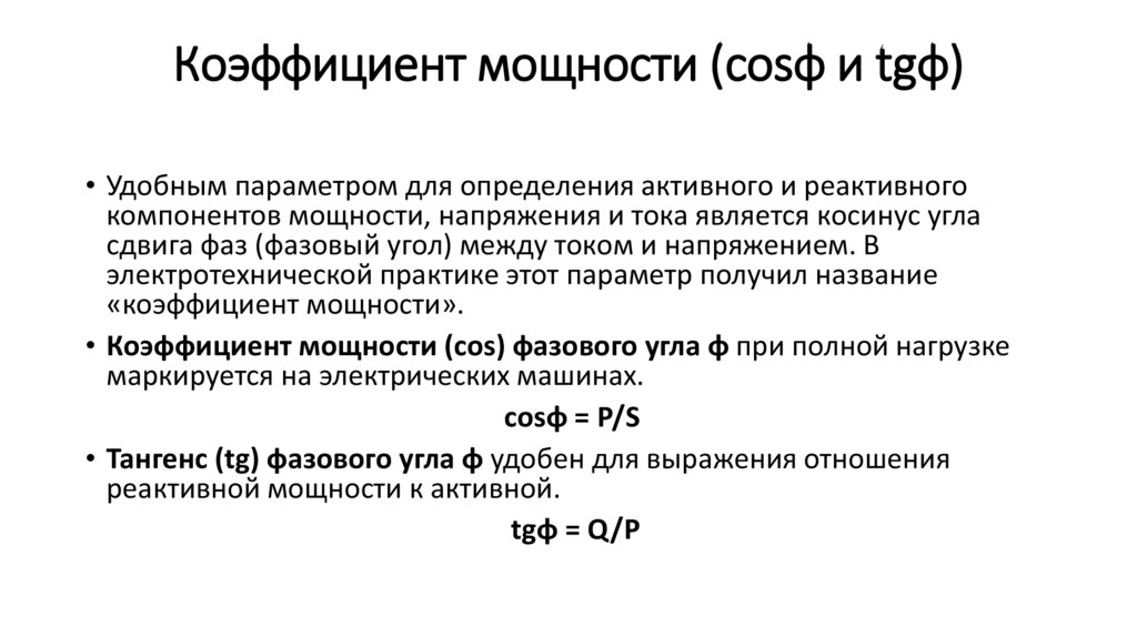 Коэффициент мощности (cosφ и tgφ)• Так как система распределения электроэнергии должна быть рассчитана на