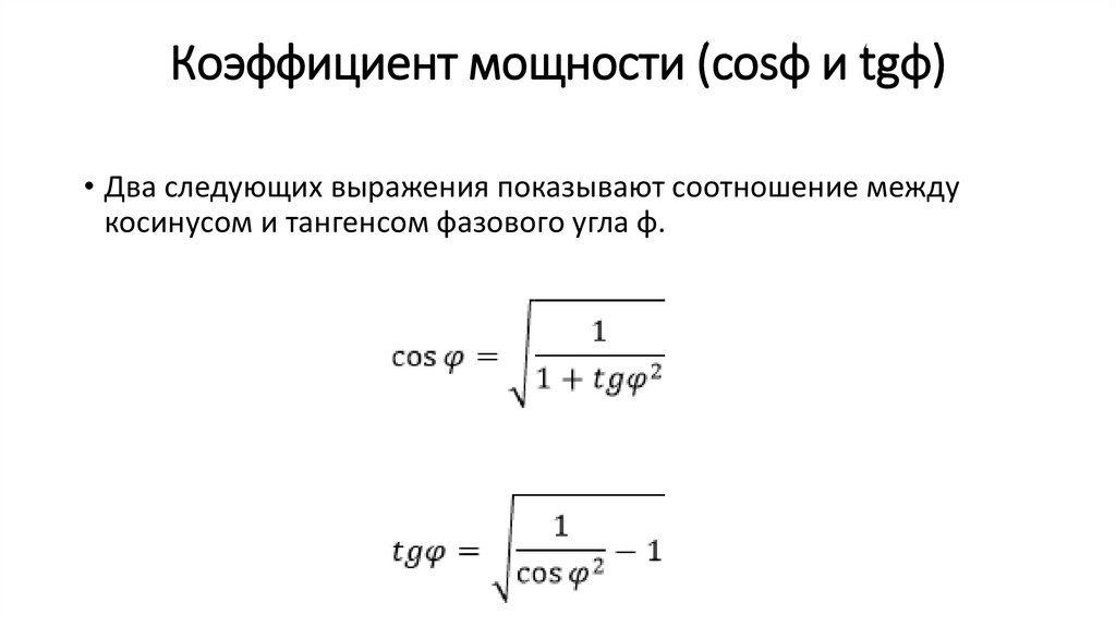 Коэффициент мощности (cosφ и tgφ)• Два следующих выражения показывают соотношение между