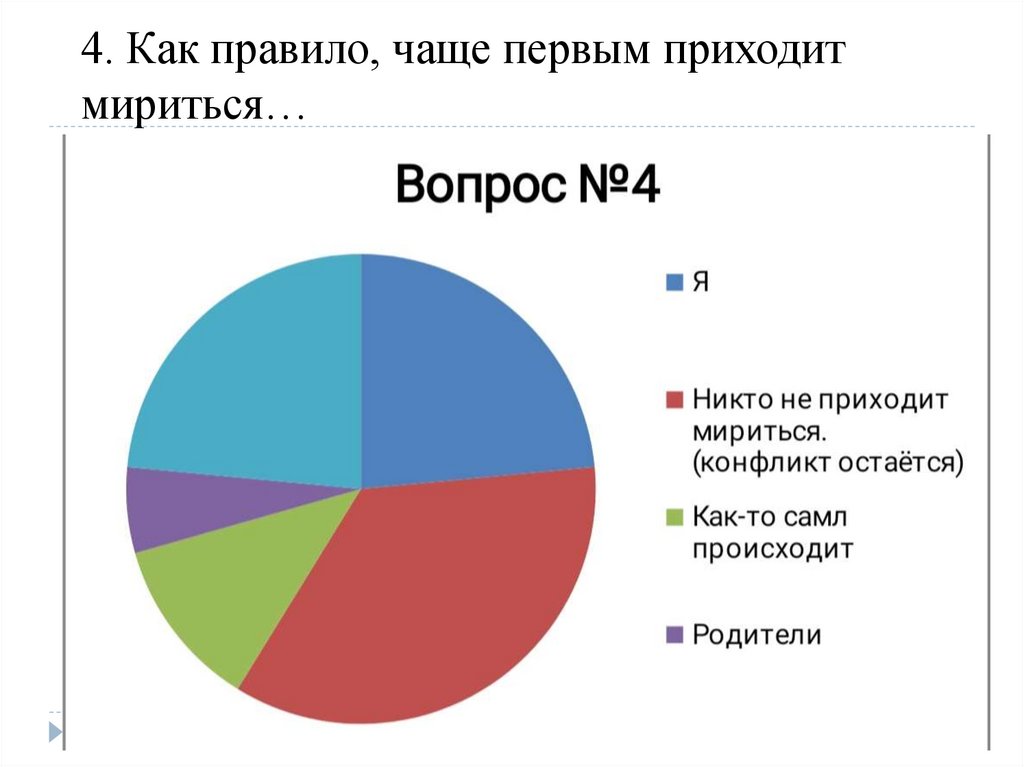 1. Я; 2. Родители; 3. Никто не приходит мириться. (конфликт исчезает); 4. Никто не приходит мириться.