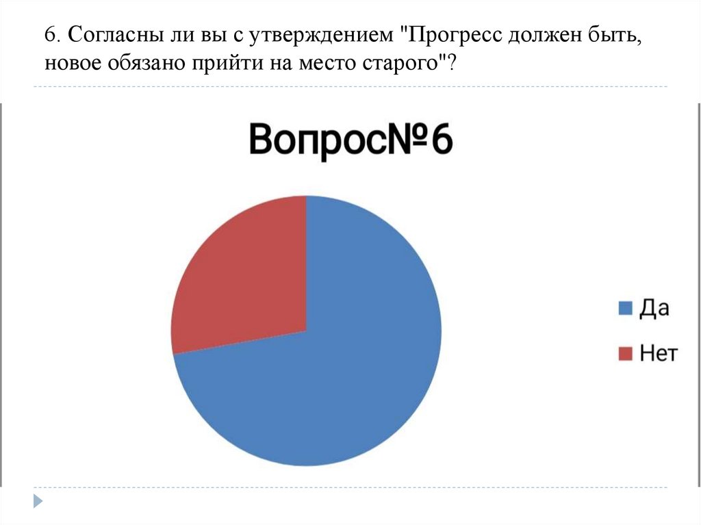 6. Согласны ли вы с утверждением "Прогресс должен быть,новое обязано прийти на место старого"?