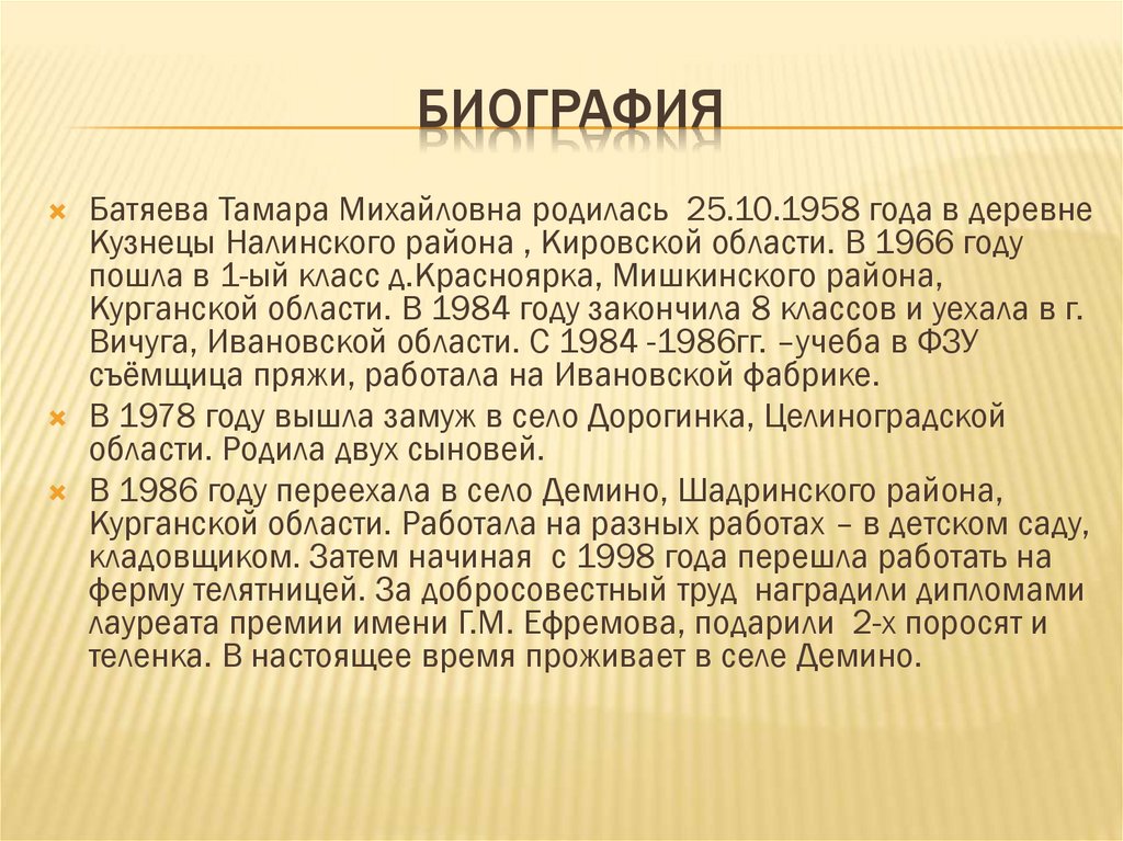 БИОГРАФИЯБатяева Тамара Михайловна родилась 25.10.1958 года в деревне