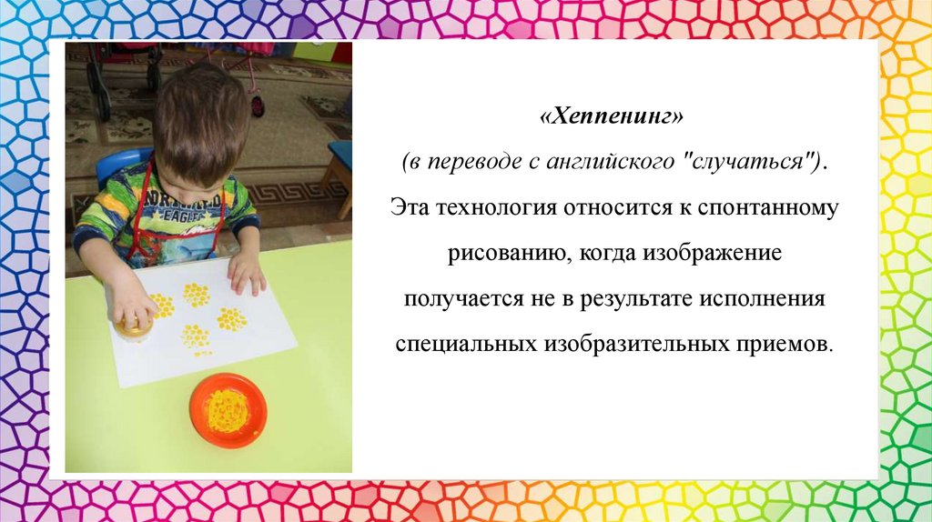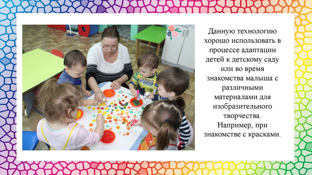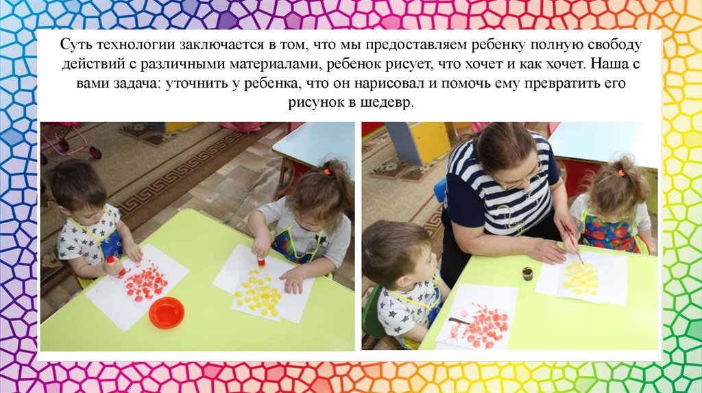 Суть технологии заключается в том, что мы предоставляем ребенку полную свободудействий с различными материалами, ребенок рисует, что хочет и как хочет. Наша с