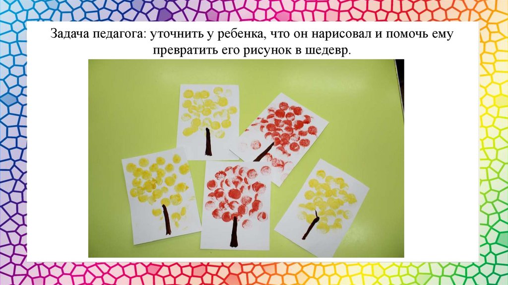 Задача педагога: уточнить у ребенка, что он нарисовал и помочь емупревратить его рисунок в шедевр.
