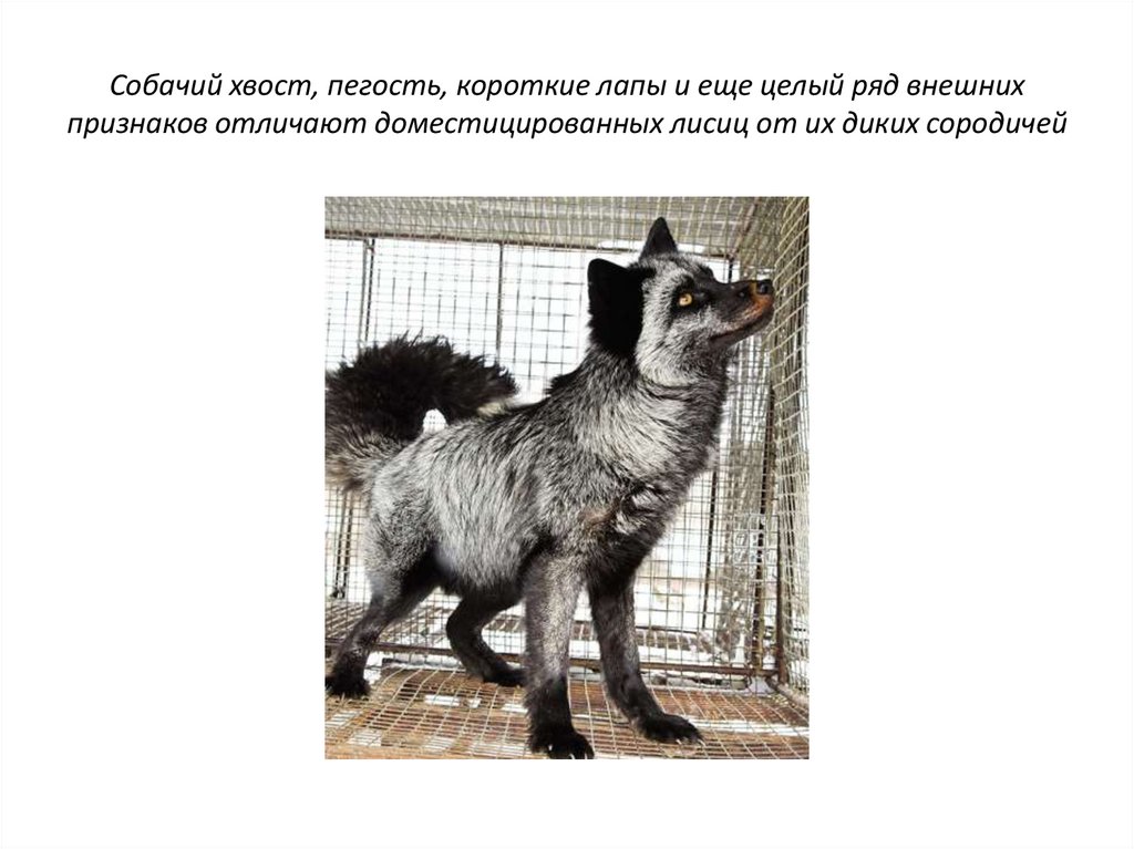 Собачий хвост, пегость, короткие лапы и еще целый ряд внешнихпризнаков отличают доместицированных лисиц от их диких сородичей