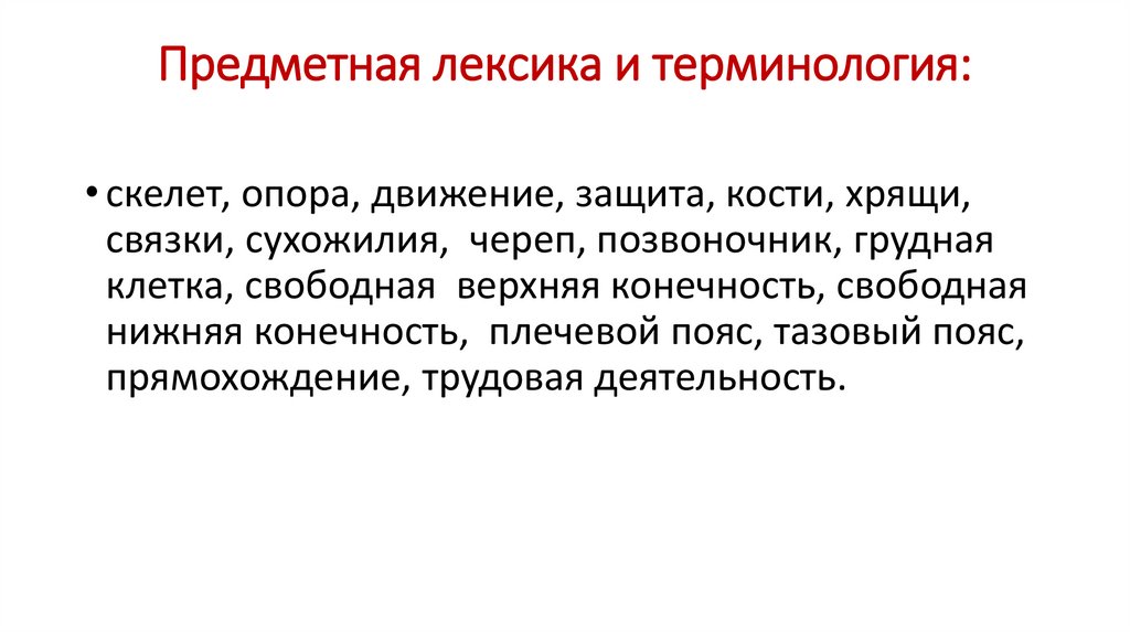 Предметная лексика и терминология:• скелет, опора, движение, защита, кости, хрящи,