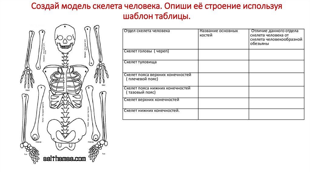 Создай модель скелета человека. Опиши её строение используяшаблон таблицы.