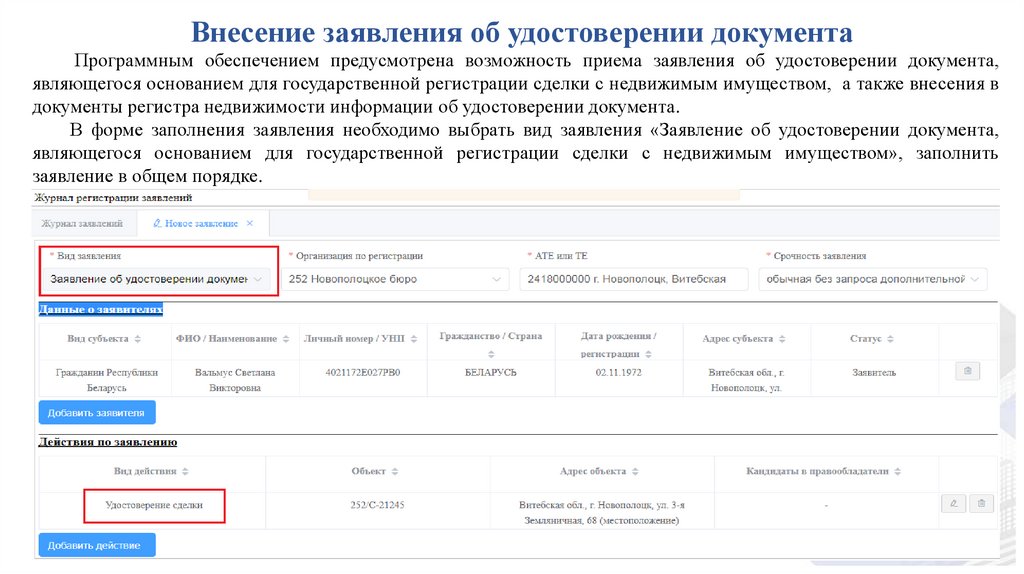 Внесение заявления об удостоверении документаПрограммным обеспечением предусмотрена возможность приема заявления об удостоверении документа,