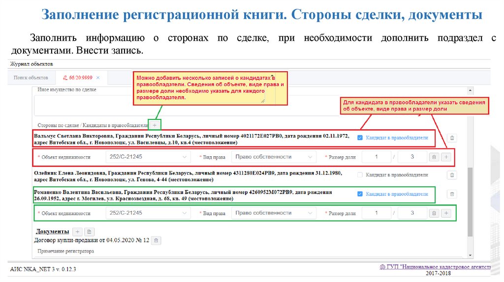 Заполнение регистрационной книги. Стороны сделки, документыЗаполнить информацию о сторонах по сделке, при необходимости дополнить подраздел с