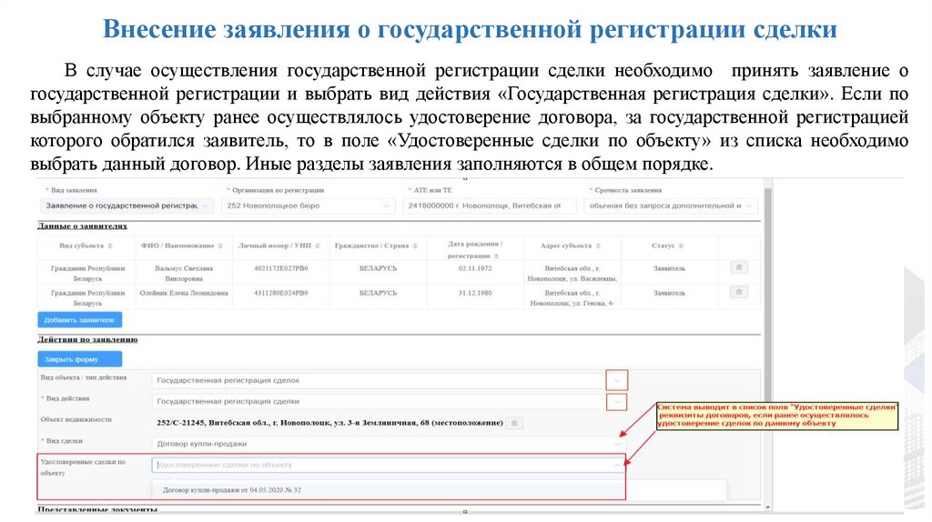 Внесение заявления о государственной регистрации сделкиВ случае осуществления государственной регистрации сделки необходимо принять заявление о