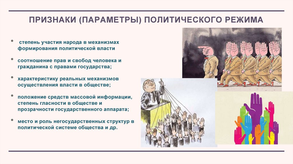 ПРИЗНАКИ (ПАРАМЕТРЫ) ПОЛИТИЧЕСКОГО РЕЖИМАстепень участия народа в механизмах