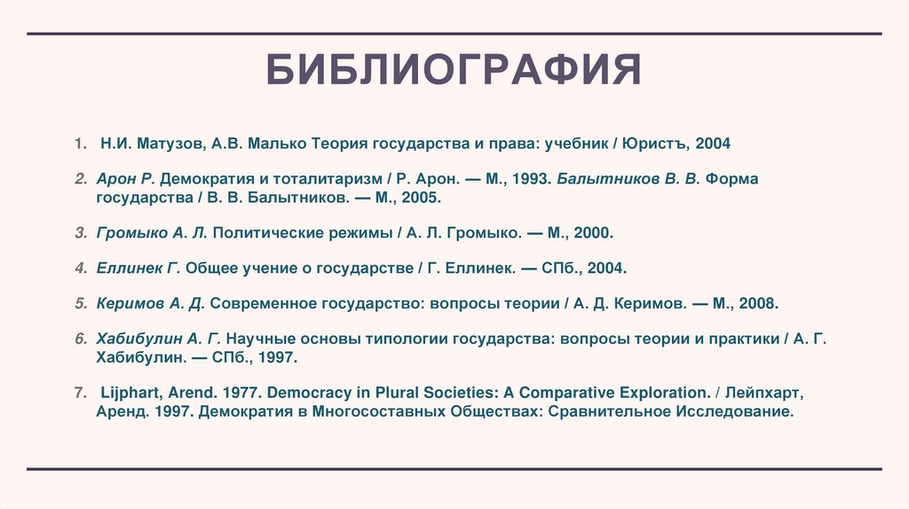 БИБЛИОГРАФИЯ1. Н.И. Матузов, А.В. Малько Теория государства и права: учебник / Юристъ, 2004