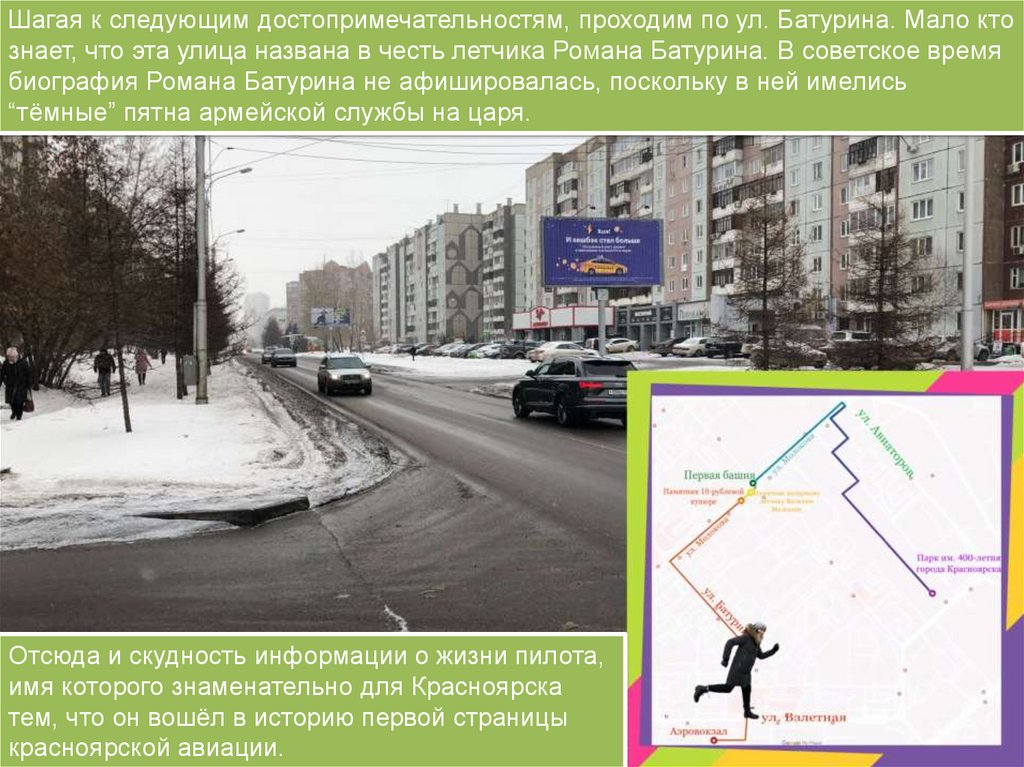 Шагая к следующим достопримечательностям, проходим по ул. Батурина. Мало ктознает, что эта улица названа в честь летчика Романа Батурина. В советское время