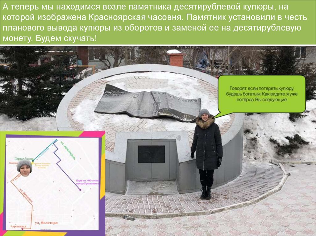 А теперь мы находимся возле памятника десятирублевой купюры, накоторой изображена Красноярская часовня. Памятник установили в честь