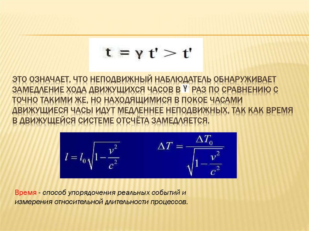 ЭТО ОЗНАЧАЕТ, ЧТО НЕПОДВИЖНЫЙ НАБЛЮДАТЕЛЬ ОБНАРУЖИВАЕТЗАМЕДЛЕНИЕ ХОДА ДВИЖУЩИХСЯ ЧАСОВ В "" РАЗ ПО СРАВНЕНИЮ С