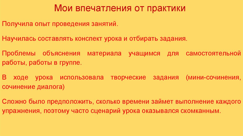 Мои впечатления от практикиПолучила опыт проведения занятий.