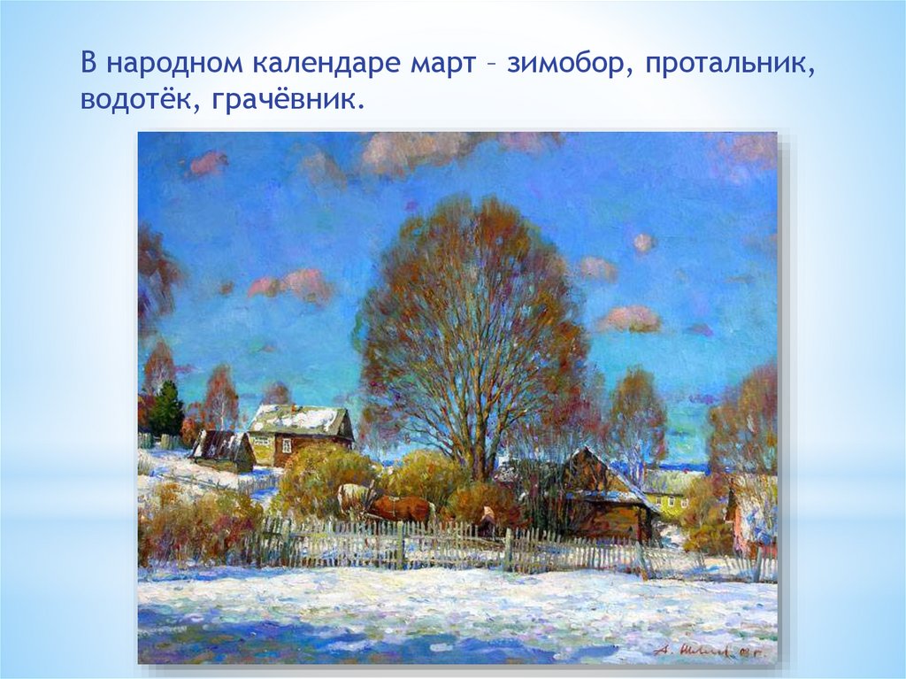 В народном календаре март – зимобор, протальник,водотёк, грачёвник.
