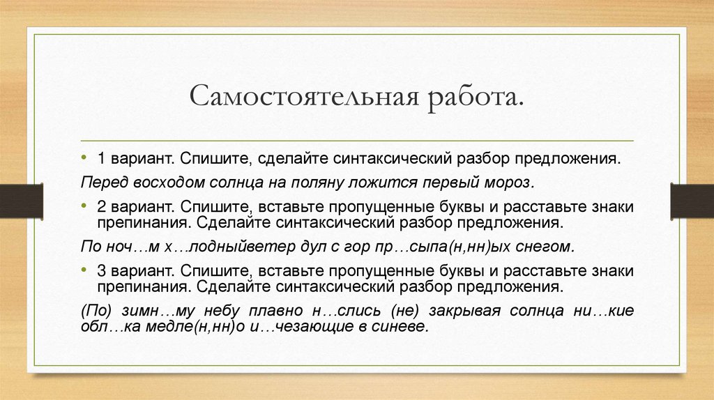 Самостоятельная работа.• 1 вариант. Спишите, сделайте синтаксический разбор предложения.