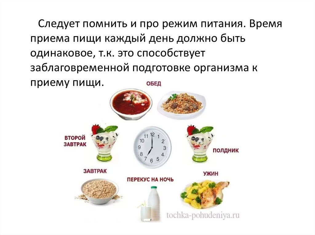 Следует помнить и про режим питания. Времяприема пищи каждый день должно быть
