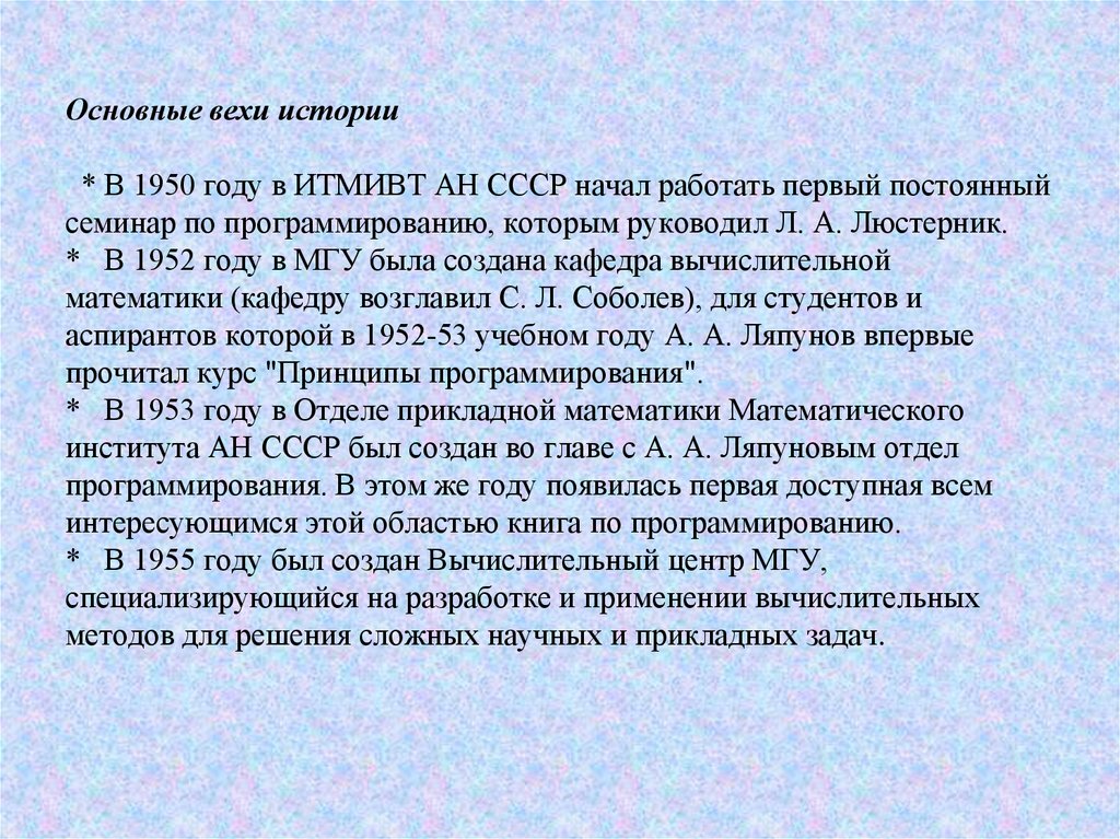Основные вехи истории* В 1950 году в ИТМИВТ АН СССР начал работать первый постоянный