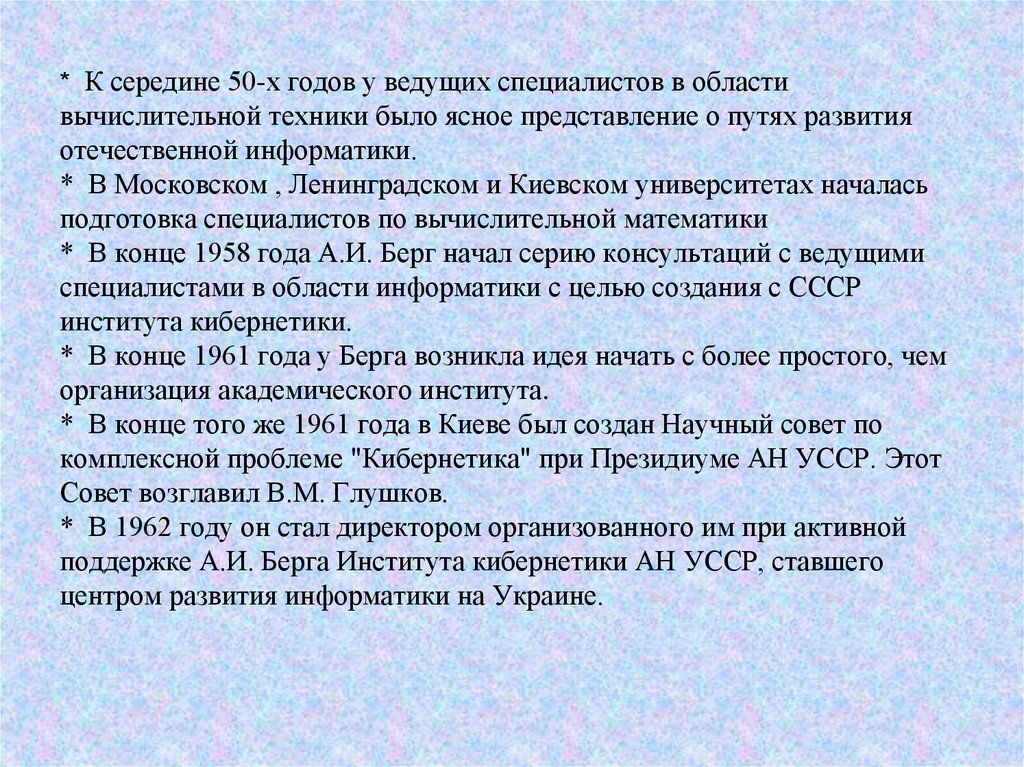 * В конце 1958 года А.И. Берг начал серию консультаций с ведущими