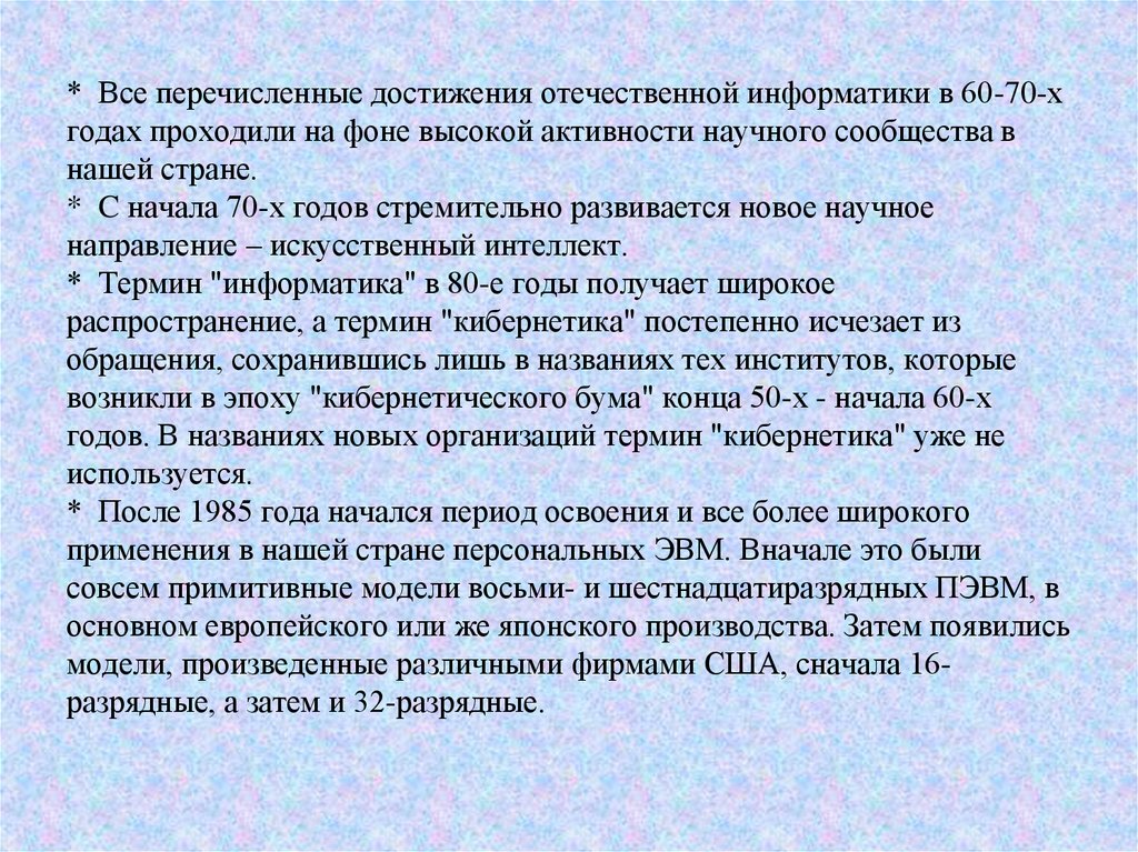 * Все перечисленные достижения отечественной информатики в 60-70-хгодах проходили на фоне высокой активности научного сообщества в