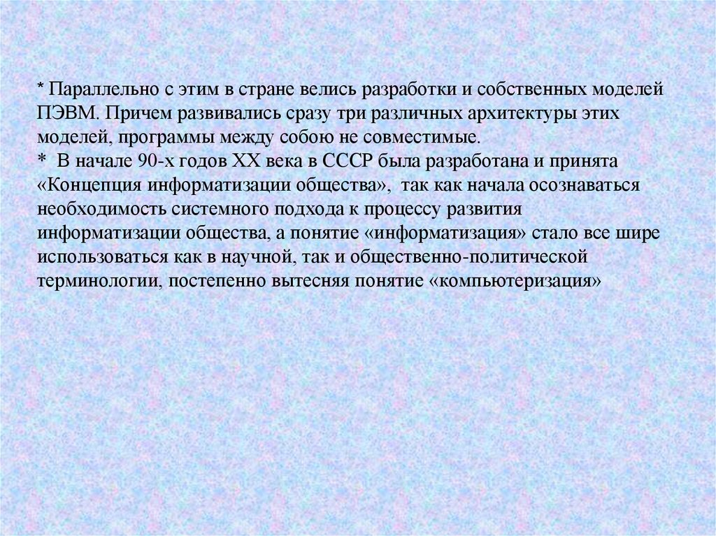 * Параллельно с этим в стране велись разработки и собственных моделейПЭВМ. Причем развивались сразу три различных архитектуры этих