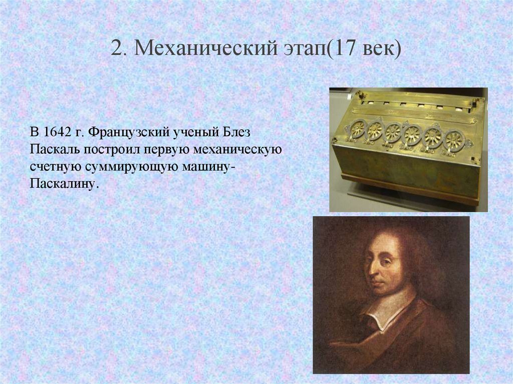 2. Механический этап(17 век)В 1642 г. Французский ученый Блез