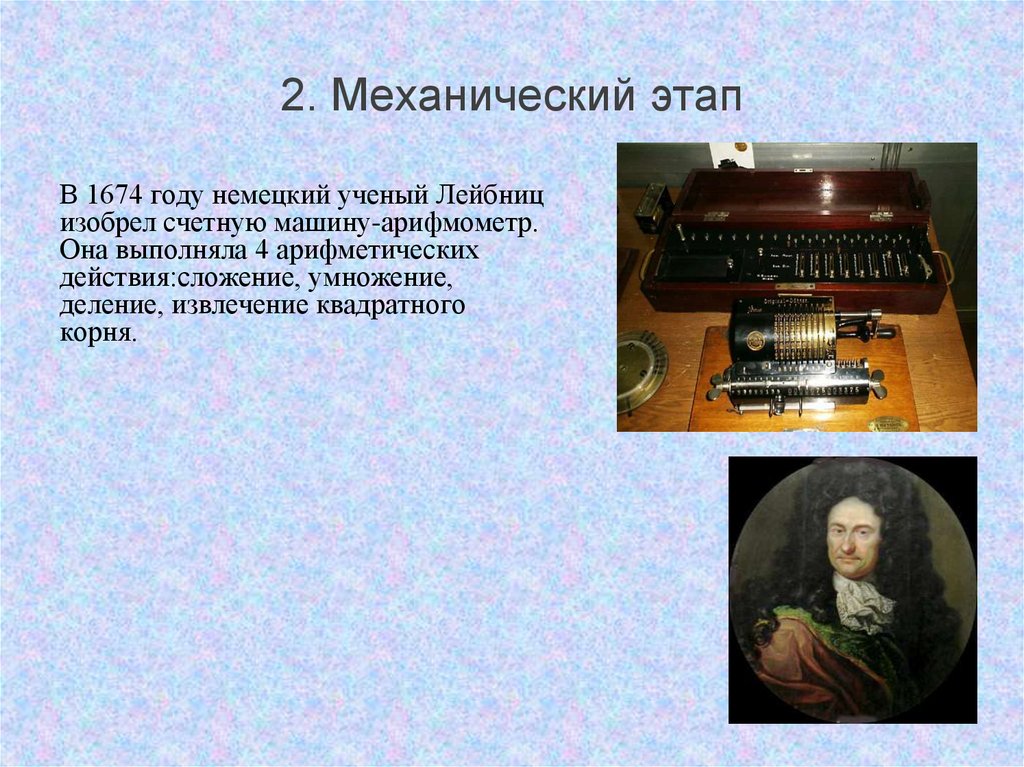 2. Механический этапВ 1674 году немецкий ученый Лейбниц