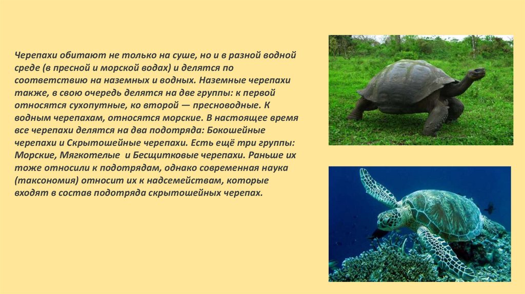 Черепахи обитают не только на суше, но и в разной воднойсреде (в пресной и морской водах) и делятся по